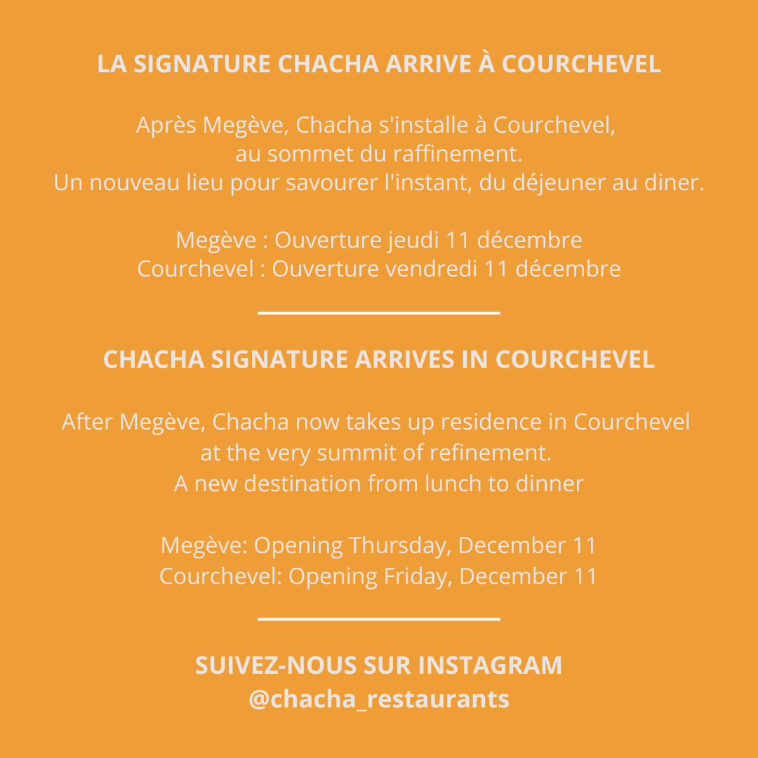 Cuisine ouverte et lumières tamisées, c’est dans le même esprit d’élégance qu’à la carte on retrouve tout le savoir-faire et l’ADN du Chacha, qui propose une cuisine authentique et de terroir tout en sublimant les produits de la région.